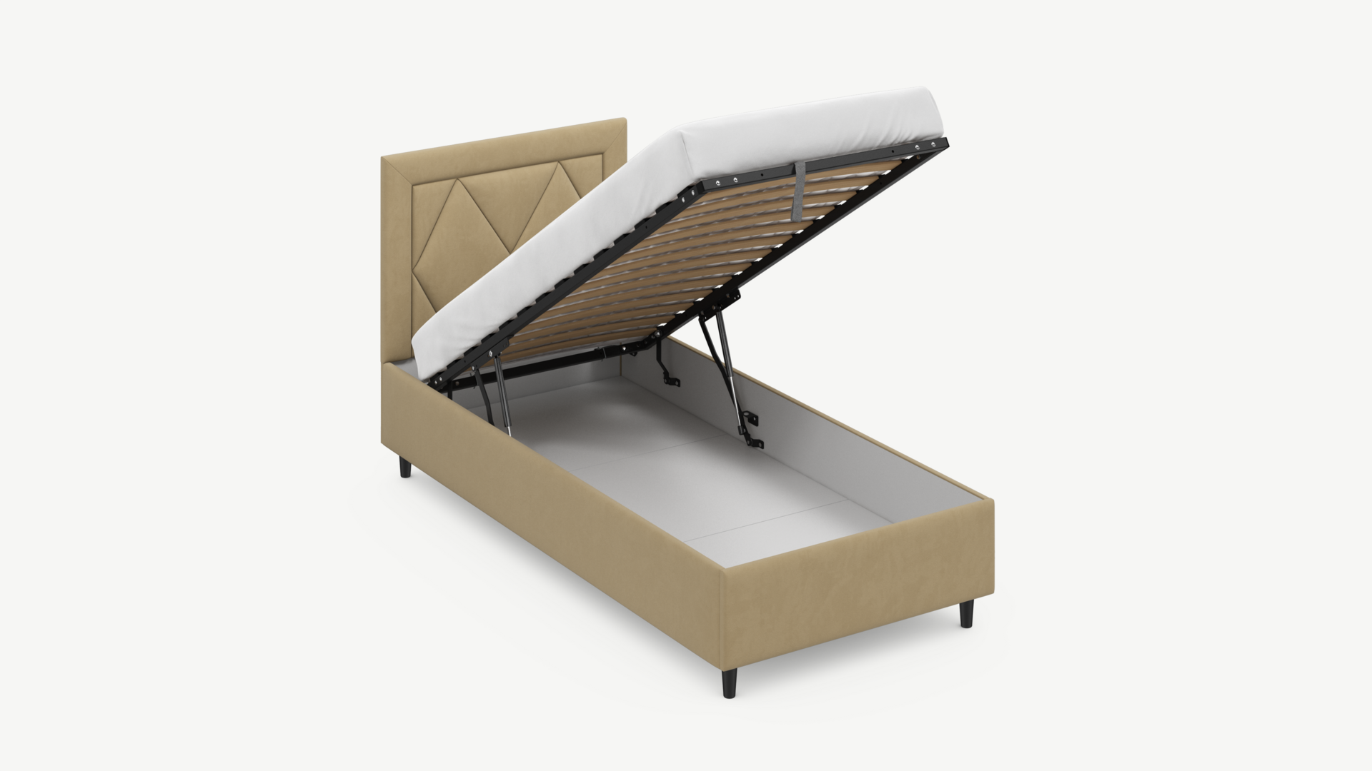 • Скрытая под основанием вместительная емкость без внутренних перегородок позволяет использовать всю площадь подкроватного пространства для хранения вещей.
