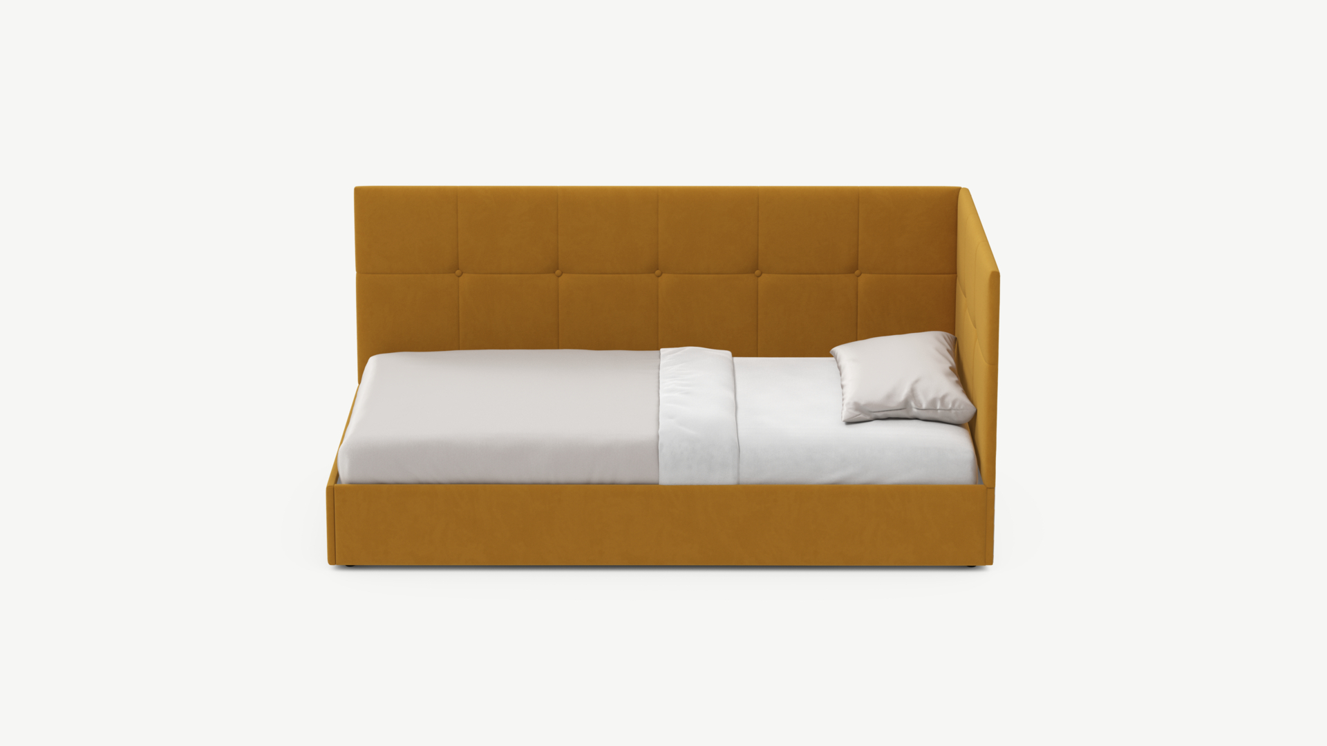 Угловая односпальная кровать MOON FAMILY 1261 с мягкой спинкой и изголовьем создаст в Вашей спальне ощущение уюта. Крупная квадратная стежка привносит в интерьер графических акцентов, а вставка из пуговиц наполняет пространство ощущением домашнего тепла.