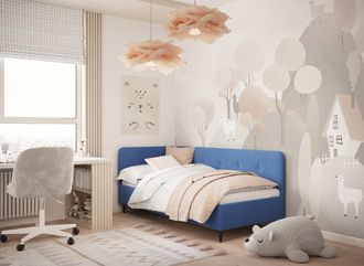 Угловая односпальная кровать MOON FAMILY 1253 с мягкой спинкой и изголовьем обладает округлыми формами, привносящими в интерьер нотки нежности. Изголовье, украшенное пуговицами, добавляет окружающему пространству шарм и уют. Высокие опоры придают кровати визуальной легкости, а также обеспечивают удобство во время уборки.