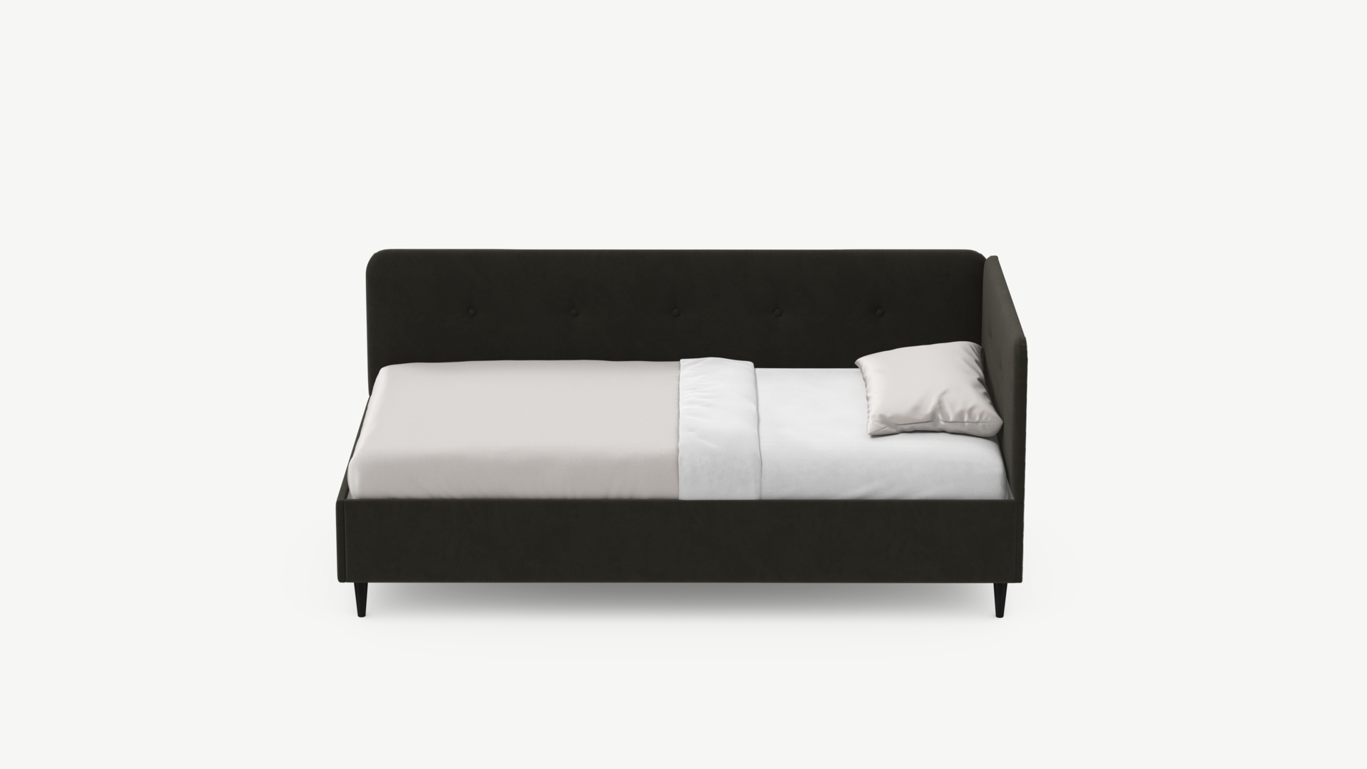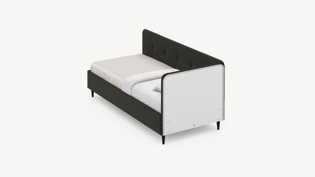 Угловая односпальная кровать MOON FAMILY 1253 с мягкой спинкой и изголовьем обладает округлыми формами, привносящими в интерьер нотки нежности. Изголовье, украшенное пуговицами, добавляет окружающему пространству шарм и уют. Высокие опоры придают кровати визуальной легкости, а также обеспечивают удобство во время уборки.